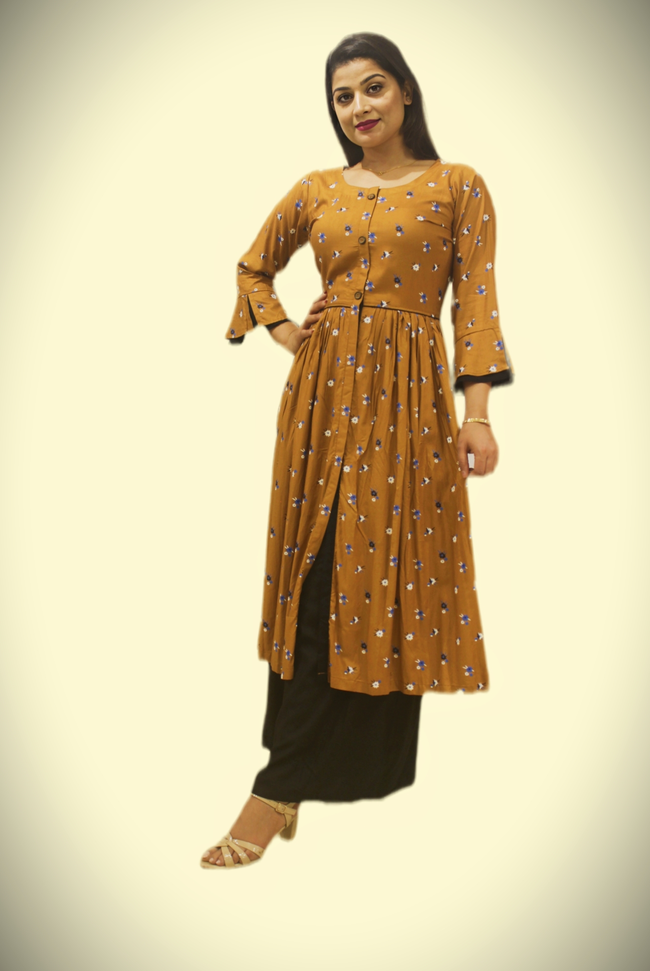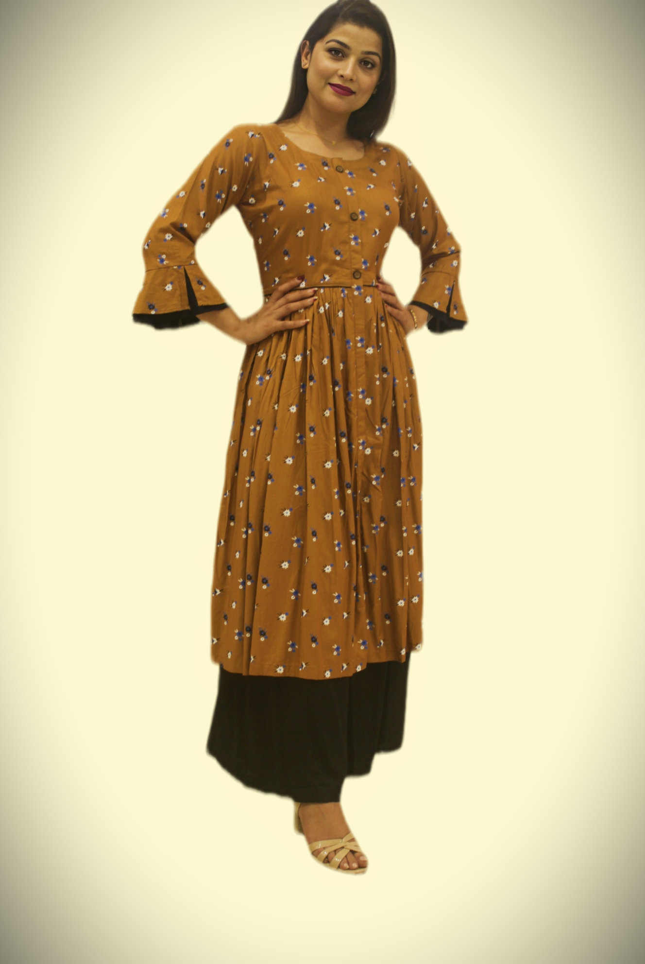 Brown printed A-line kurta round neck 3/4 , regular sleeves mide length in flared hem.