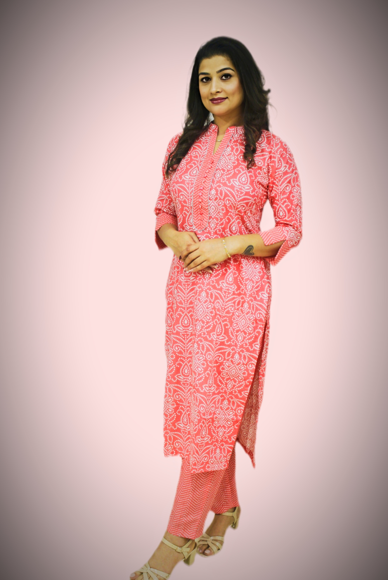 Magenta jaipuri printed kurta with pant, has ban collar with three quarter sleeves.